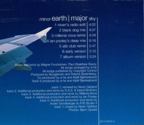 The inimitable sound of a-ha is so evident on "Minor Earth Major Sky". I like it when you get a fistful of re-mixes of a song that you just love. Initially this song reminded me of their output from the EAST OF THE SUN WEST OF THE MOON album but with a greater rock sound behind it. The Millenia Nova mix has a very ethereal and gossamer esoteric feel to it. It just lifts you away. I liked the Black Dog re-mix. It gently rocks. The album version is my favorite. The early version has a raw quality behind it, which I also like. The two dance mixes just don't fit this song. "Minor Earth Major Sky" is just so rich and melodic.