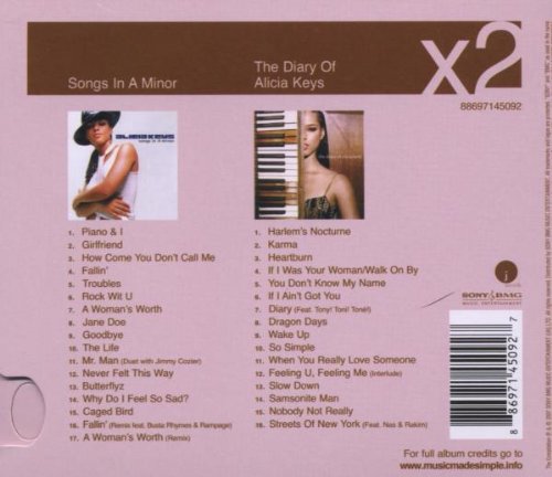 Songs in A Minor/The Diary of Alicia Keys (2PC) Alicia Keys Label: Sony BMG Europe Release Date: 6/24/2008 DISC 1: SONGS IN A MINOR: 1. Piano & I 2. Girlfriend 3. How Come You Don't Call Me 4. Fallin' 5. Troubles 6. Rock Wit U 7. Woman's Worth, A 8. Jane Doe 9. Goodbye 10. Life, The 11. Mr. Man 12. Never Felt This Way 13. Butterflyz 14. Why Do I Feel So Sad 15. Caged Bird 16. Fallin' 17. Woman's Worth, A DISC 2: THE DIARY OF: 1. Harlem's Nocturne 2. Karma 3. Heartburn 4. If I Was Your Woman / Walk On By 5. You Don't Know My Name 6. If I Ain't Got You 7. Diary 8. Dragon Days 9. Wake Up 10. So Simple 11. When You Really Love Someone 12. Feeling U, Feeling Me (Interlude) 13. Slow Down 14. Samsonite Man 15. Nobody Not Really (Interlude) 16. Streets Of New York