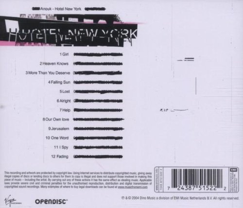 Hotel New York, Anouk's 4th studio album is among her best cd's. It shows her versatility (pop, reggae, rock, ballads) and has some of her best songs and performances. Hard to pick hightlights but I should mention the poppy hit 'Girl', the rousing 'More Than You Deserve' and 'Jerusalem' and the absolutely gorgious ballads 'Lost' and 'One Word'.