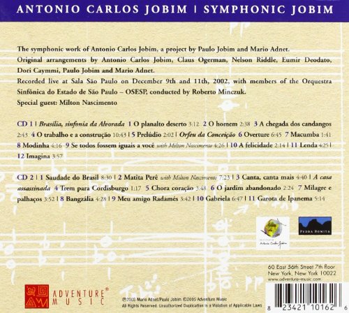The symphonic work of Antonio Carlos Jobim recorded live at Brazil's Sala Sao Paulo with members of the acclaimed Orquestra Sinfonico do Estado de Sao Paulo. Produced by Paulo Jobim and Mario Adnet with arrangements by Nelson Riddle, Eumir Deodato and others including Antonio Carlos Jobim himself. This tribute to the father of 20th Century Brazilian Pop and Samba Music features guest performances by Milton Nascimento, Duduka de Fonseca, Teco Cardoso, Benjamin Taubkin and others. This two CD set is a fitting tribute to one of the world's greatest composers.