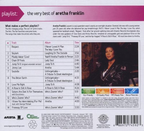 - Look, it's been said before, but it's true. You just can't summarize Aretha Franklin on a single disc. It's impossible. 'Playlist' is a nice attempt (and it's better than the previous multi-label compilation, 2001's 'Aretha's Best' by a country mile, despite that disc having more songs), but there's too much missing. I know that Atlantic is owned by Warner and Legacy is owned by Sony BMG (two rival labels), but why not include 'Think' or 'You Make Me Feel Like a Natural Woman'? Or perhaps a '70s classic like 'Rock Steady' or 'Spanish Harlem'? Surely, if they could license 'Respect' and 'Chain of Fools' for this collection, it couldn't be that hard to license one of those.