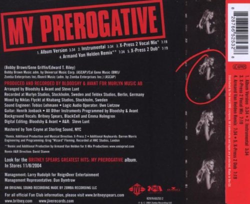 No other song from 2004 is more pretentious, calculated, and defiantly outrageous than "My Prerogative", in which Britney Spears becomes probably the first pop artist in history to consider Bobby Brown, a.k.a. Mr. Whitney Houston with a laundry list of legal offenses, worthy enough of covering. A year filled with an annulled marriage, a slight boost in her music career, tabloid coverage of barefoot gas station visits, a greatest hits CD with plans of retirement, and then another marriage just to get our knickers in a twist, and Britney exclaims over a snarling bass "everybody's talkin' all this stuff about me" as if she had done nothing but sit pretty on her famous ass all year. It`s difficult to take her woes of fame seriously, but after "Toxic" there's little room to deny that Ms. Spears/Federline is on a roll of producing some top-notch pieces of pop thrash. However brash and sleazy "My Prerogative" may appear, it's undoubtedly one of her catchiest efforts yet- further proof that all a pop star needs is a bit of laughable irony to erect a solid single.