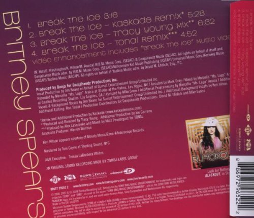 German enhanced CD pressing of the third single pulled from her Blackout album. 'Break The Ice' was written by Nate "Danja" Hills, Marcella "Ms. Lago" Araica, Keri Hilson and James Washington, and is Electropop at it's very best. Features five versions of 'Break The Ice': Main Version, Kaskade Remix, Tracy Young Mix, Tonal Remix and Enhanced Video. RCA.