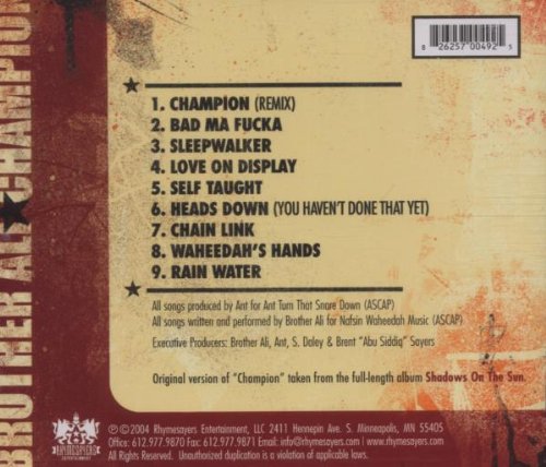 I had the good fortune of picking up Brother Ali's previous release, Shadows on the Sun, during a trip to Minnesota last year and that thing stayed in my discman for months. This summer, I went back to Minnesota and found the Champion EP waiting for me at the Fifth Element. Bought it...and here it will stay in my CD player for many more months. 9 new tracks all worth hearing again and again....well worth the price.
