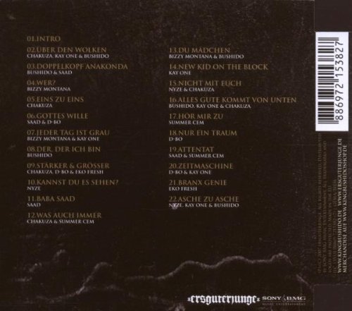Bushido Album: «Ersguterjunge Sampler Vol. 3» See larger image Bushido Album: «Ersguterjunge Sampler Vol. 3» Close See other view Bushido Album: «Ersguterjunge Sampler Vol. 3» Close Album information Title:Ersguterjunge Sampler Vol. 3 Release date:2007-12-11 Type:Audio CD Label:Phantom Sound & Vision UPC:886972153827 Buy Review - Product Description All products are BRAND NEW and factory sealed. Fast shipping and 100% Satisfaction Guaranteed.