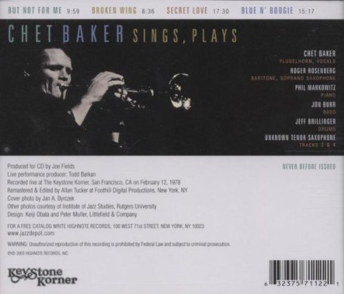 The extraordinarily popular, cool-toned and fragile singing trumpeter with the looks of a movie star is back in the jazz world's public eye again, with a new (2003) biography out and a movie deal in the works. Chet Baker started out on top in the 1950s, gigging with Charlie Parker, joining the Gerry Mulligan Quartet and soon becoming one of the most popular trumpeters in jazz. The late 50s and early 60s found Baker at the nadir of his career and suddenly he was out of music. Against all odds he made a comeback in the mid-70s. Some say this was his prime, 'master improviser, master line player, great time.' This CD documents a set taken from a live performance at San Francisco's Keystone Korner. It is a snapshot of Baker at work, singing and playing. Four tracks. Never before issued. High Note. 2003.