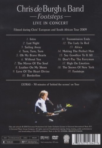 NTSC/Region 0. Filmed during his sell-out 2009 world tour, Footsteps - Live In Concert captures Chris, his band and his audience combining to create a memorable and vibrant performance. Shot at concerts in Europe and in South Africa, footage opens with the show's atmospherically-lit and sound-tracked "Intro" and features an 18-song set, with material taken from Chris's extensive back catalogue of hits, including the seminal ballad "Lady In Red", and also performances of songs from his latest internationally successful album Footsteps, a hand-picked selection by Chris of songs which have influenced his own career and writing.