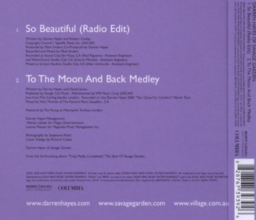 "So Beautiful" is one of two new tracks on the Savage Garden best of Truly, Madly, Completely, along with "California Home" (both penned by Darren, and not a collaboration with bandmate Daniel Jones as originally planned). There are three singles, one in Australia and two in England, that each feature non-album mixes and B-sides.