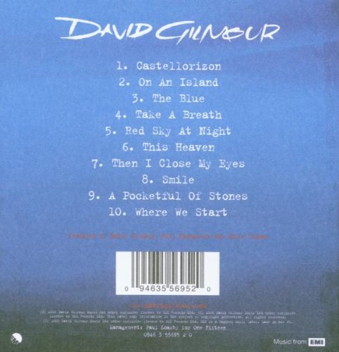 Most of the lyrics here were written by Gilmour's wife Polly Samson, and although they occasionally lean towards the sickly-sweet end of things, as on "Smile", they're hardly as embarassing as some of the reviewers make them out to be. And ultimately, Gilmour makes up for it with the music. The title track is sumptuous--it sounds kind of like an acoustic modification of Floyd's "Breathe", featuring superb guitar work, live orchestration, and vocal harmonies from Crosby & Nash that really take the song to the next level (Richard Wright plays the Hammond on this track as well). The super-mellow "The Blue" has a wonderfully serene, blissful feel to it, with gentle harmonica and a remarkably effective back-and-forth piano line, and Gilmour's extended soloing, even if he overdoes those swooping sounds a bit, is still really really nice, with extremely impressive tone. The relatively short instrumental "Red Sky At Night" is an intriguing change of pace, with Gilmour switching over to saxophone, and to excellent effect--he brings the same kind of unique feeling to his sax soloing as he does to his emotional guitar leads. "A Pocketful Of Stones" is also a really fine ballad, with Gilmour's vocal making the most of the wonderful lilting melodicism on the verses. "This Heaven" adds a welcome diversity to the proceedings, shuffling along nicely and containing a nice bluesy acoustic riff. "Smile", like I said, is kind of on the sugary side, but the acoustic slide guitar work, Gilmour's somewhat jazz-tinged lead vocal, and the sheer tunefulness give it much appeal.