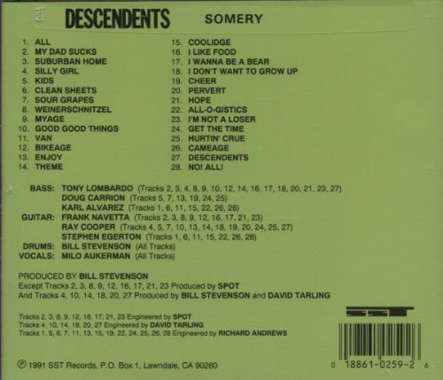 Altough Milo Goes to College is their essential album, this compilation gives a much better overview of the Descendents' sound (MGTC focuses mainly on their hardcore, savage side). Somery, on the other hand, mixes their hardcore sound (songs like "I'm not a loser" and "Hurtin' Crue"), their melodic (but, never whimpy) pop-punk songs about girls ("Cameage", "Cheer", "Silly Girl"), their songs of pure adolescent sillyness and immaturity ("Van", "Enjoy", "All-O-Gistics", "Pervert"), and, of course, their famous (or infamous) 1-10 second "songs" ("All", "I like food", "Weinerschnitzel").