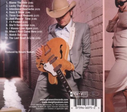 But what really brings these sad tales of love gone wrong to life is Dwight's unique and expressive voice. In my opinion, Dwight's voice only gets better with age. The older he gets, the more you're able to notice the powerful yet subtle nuances embedded in his rich, sweet voice. On slower ballads such as "Lucky That Way", "Does It Show", "Just Passin' Time", and "The Last Heart in Line", his voice posesses such believable earnesty and uninhibited emotion that he really makes you feel his hoplessness and pain. On the other hand, with the rockin', fast-paced tunes like "Intentional Heartache", "Three Good Reasons", and "Watch Out", his voice has a biting authenticity that just keeps you hanging on his every word.