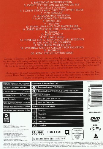 The DVD, Elton John Live In Barcelona, was a shot at his first ever live concert, ever to video. The process was highly made to reflect his record, The One. Originally named Elton John, Live World Tour 1992, the concert remains the same as it was originally collected. The remastering process was beautiful, and not a flaw within the works. Still, if you have the VHS version of this concert, you're not missing anything here. The performance highlights the exact same number of songs that were on the VHS version, like The Last Song, Burn Down The Mission, Sacrifice, Don't Let The Sun Go Down On Me, and others. The sound quality is much better than it was on the VHS version, which isn't sold anymore. Still, Elton John does give his all, like he always seems to, and that is exactly what he is made to do.