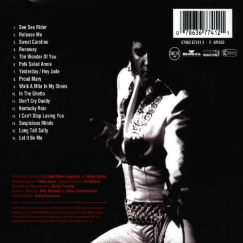 The focus here (and henceforth) is on "new" material, rather than the rock & roll songs that made Elvis a star, with big but remarkably supple arrangements backing the finest set of vocal cords ever recorded. Elvis tackles a range of eras and styles, finding new things to do with CCR's "Proud Mary," Neil Diamond's "Sweet Caroline," Del Shannon's "Runaway" and a saccharine staple like "Let It Be Me" literally without missing a beat. But it's the additional cuts that really make this set. "Walk a Mile in My Shoes" is in itself worth the price of the disc, but hearing the band slow its groove down in the closing moments and effortlessly turn it into "In the Ghetto" is a bit of concert magic on a par with anything anyone else was doing in 1970, and that's saying a lot. Even the schmaltzy "Don't Cry Daddy" gains a certain magic in this context, paving the way for a show-stopping workout on "Kentucky Rain" that manages, against all odds, to equal if not better the stellar original version. "Suspicious Minds" is given a similarly mammoth treatment, though perhaps less so than would be the case a few months later in the THAT'S THE WAY IT IS period. Only on "Yesterday" (a song I've never much cared for) does the King stumble a bit, fudging the lyrics before putting things right with a bit of the coda from "Hey Jude."