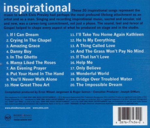 While all of these songs have been previously released (several times), this collection tries to put a new twist on them. When I first saw the title I thought "Oh boy, yet another Gospel release." While I love Elvis' Gospel recordings, they have been repackaged and released several times, but this collection includes not just Gospel songs, but also secular songs meant to inspire the listener with their message. I have always thought that Elvis' "If I Can Dream" was one of the most moving (and underrated) songs of the late 60's and it gives the collection a strong lead-off. While this collection pales in comparison to his (numerous) greatest hits collections, this is a very good CD and not a bad buy if you don't already own most of the songs on here.