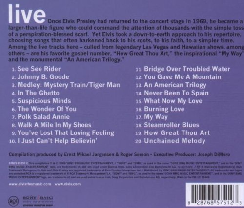 This is a first-rate 20-track compilation for anyone wanting to find out what Elvis Presley sounded like live in the last decade of his career. The selection is taken from various live albums and the songs are presented here as belonging to one single concert. The first half of the programme is covered by 1969-70 recordings with outstanding versions of "Johnny B. Goode", "Suspicious Minds" (the best-ever live cut from the 1969 "Elvis in Person" album), "Polk Salad Annie", "The Wonder of You", "You've Lost That Loving Feeling" and "Bridge Over Troubled Water". The second half features the hit single "Burning Love" taken from "Aloha" and the great 1974 live in Memphis rendition of "How Great Thou Art". The disc concludes with the unavoidable "Unchained Melody" from 1977, although they should have added "Can't Help Falling in Love", and why not the now classic 'Elvis has left the building' announcement.