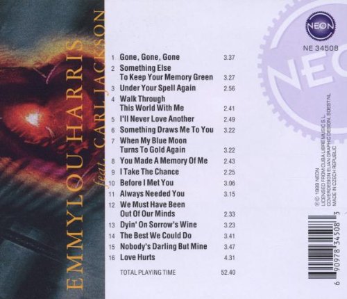 Beware fans of Emmylou Harris. This is an album by Carl Jackson, which may or may not have some backups by Emmylou. It should not be listed as an album by her and consequently I was very disappointed when I first played it.