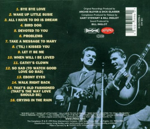 For anyone who doesn't know, the Everly Brothers were among the most successful pop/rock artists of the late 1950's-early 1960's (pre-Beatles) era. They had a string of hits during this period featuring their trademark two-part harmonies. This CD release features MOST of their biggest and best-known hits. One might quibble about an omission or two ("Claudette", which was actually the B-side of "All I Have To Do Is Dream", comes to mind), but this collection is pretty complete. If you were around then, these great old songs will bring back some memories. If you weren't, the beautiful two-part harmonies these guys recorded are a treat for the ears and a style of music not heard much these days. Either way, they're well worth having.