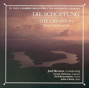 The "Creation" libretto, originally in English (sung in German, here), is based on Genesis, the Psalms, and on Milton's "Paradise Lost." Archangels, a chorus, and Adam and Eve make up the singing parts, and were usually accompanied in the eighteenth and nineteenth centuries by a large orchestra. In this 1988 recording, the singers are accompanied by the slightly smaller Saint Paul Chamber Orchestra, which plays with correctness and polish.