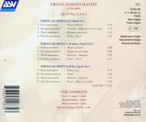 These are the first three quartets of Haydn's delightful Op. 64. The Lindsays provides energetic interpretation in a recording with excellent sound.