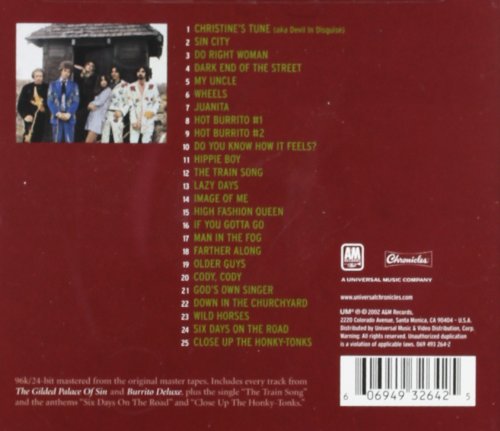 The band never had anything close to what might be called a hit (GILDED PALACE, though now acknowledged as a classic, could only manage a miserable #164 on the album chart), but they came up with songs and a style that has endured over four decades. The erratic sound quality of the original LPs has been improved upon in the remastering here, and we get to hear much more clearly the acid fuzz-tone steel of "Wheels" and the Everlys-like harmonies of Parsons and Hillman on the immortal "Sin City", to name just two. The collection also includes a cover of the 1963 Dave Dudley anthem "Six Days On The Road", which the band did at the infamous Altamont Speedway debacle of December 1969. From BURRITO DELUXE, we get the twangy Stones cover "Wild Horses" and the Cajun-influenced "Man In The Fog", co-written by future Eagle Bernie Leadon, among others.