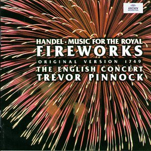This is the first time I have had the pleasure of hearing The Royal Fireworks Musick in its original 1749 form. Absolutely glorious! The following concerti, Passacaille, Gigue & Minuet and the Occasional Oratorio are an absolute delight! This very quickly became one of my favorite CDs-- not only because Handel is one of my two favorite composers (J.S. Bach being the other) but also because The English Concert is such an outstanding group. They give the listener an idea of what the music would've sounded like back in the days when REAL music was written and performed. This music is very festive. Pop open a bottle of Champagne and enjoy!