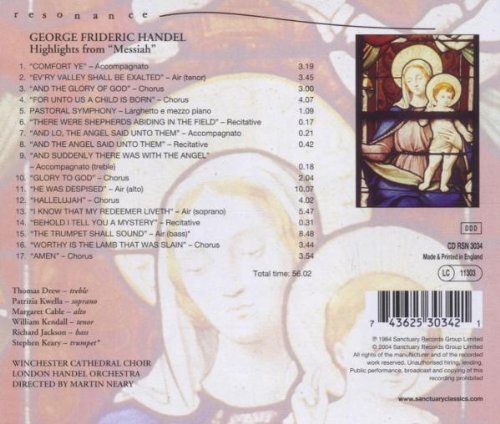 Despite some rather painful mis-steps (most notably in the bass soloist, who is forced and unattractive in an unnecessarily ornamented "The Trumpet Shall Sound"), this Messiah highlights disc is replete with a fine mix of arias and choruses from Handel's most famous work. The rest of the soloists are admirable, especially tenor William Kendall and treble Thomas Drew, who bring out marvelously clear, supple vocals. The Winchester Cathedral Choir has a wonderful blend of young voices give the choruses a bright freshness, and conductor Martin Neary's tempos and interpretations are all neat and unaffected. This is a small ensemble, which means that you won't find thunderous power during "Hallelujah" or "Worthy Is The Lamb", but there is plenty of crisp diction, wonderful intonation, and youthful enthusiasm. I only wish that this was a complete recording, as several fine songs are missing. Worth adding to your Messiah collection.