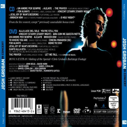 The 37-minute CD offers seven songs performed in the concert (including the two not on the previous CD, "Broken Vow" and "For Always"), plus "O Holy Night." The DVD has excellent picture and sound (PCM stereo, Dolby Digital 5.1, and DTS), interviews, and backstage footage, and the combination with the CD is an excellent value. Groban's fans, of course, will consider it a treasure at any price. --David Horiuchi
