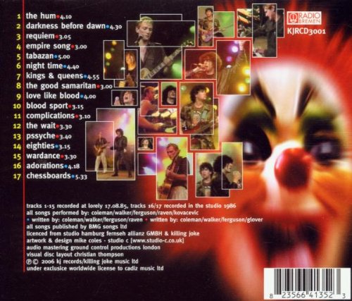 I get a kick out of reading the KJ reviews in here. Many adhere to the 'Where's the savagery?' argument, while missing the point. Killing Joke have been about seeking balance within the savagery for many years now. In the mid-80's (when this show was recorded) they hit their stride in Europe with a few hit singles (while America obsessed over the likes of Johnny Cougar) and were probably on the bill with several other global heavyweights at this large outdoor concert. Compare even this material with what was popular at that time, and surely you can hear the difference. Geordie is still one of a kind, and he's really on fire during this show (check out "Kings and Queens"). Jaz's vocals do seem a bit subdued (maybe all that daylight) but he starts off the show with dark humor, announcing "It's good to be back in the USA!" (they're in Europe - Lorely, actually) and there's a certain perverse twist to including "Good Samaritan" on the setlist with its cavernous droning. Otherwise, this tour showcases just how good the most intense band in the world can get once they soften the edges a bit, yet still handle an element of menace ("Darkness Before Dawn") that was unequalled anywhere else.