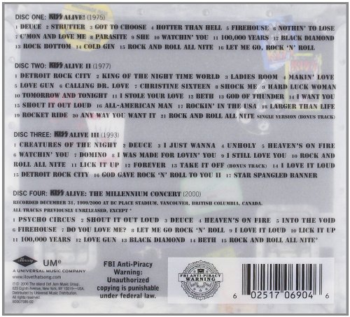 THE DISCS: (2006) 4 discs containing 69 tracks and lasting over 291 minutes. Disc-1 ("Alive!" 1975) at 77+ minutes; Disc-2 ("Alive II" 1977) at 74+ minutes; Disc-3 ("Alive III" 1993) at 73+ minutes; Disc-4 ("The Millennium Concert" 1999) at 66+ minutes. The case is a 5-side cardboard foldout. Included with the discs is an extensive 72-page booklet containing numerous band photos (many unreleased), band members, song titles/credits, excerpts from band interviews, and all original artwork from Alive I - III. Digitally remastered sound. Label - Mercury.
