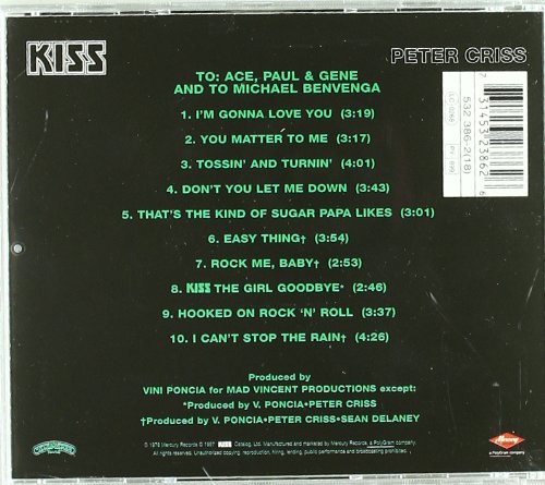 This album has been run roughshod over since the day it was released. Its critics lambaste it for not sounding like a KISS record, which isn't entirely true - many of the songs on this album have a similar feel to the group's cuts that feature Criss prominently, (think "Nothin' To Lose," and "Mainline"). Probably due to the (much-deserved) success of Beth, Criss has never been recognized as the fine r&b/soul vocalist he truly is, and more than any other member of the band, he went into the studio to produce the album he couldn't make within the confines of KISS. With a rasp somewhere between Bruce Springsteen and Rod Stewart, Criss tempers the expected ballads with equal doses of rock and funk. Opener "I'm Gonna Love You" is a first-rate soul stomper, complete with punchy horns and Supremes-style back-ups. "Easy Thing" and "I Can't Stop the Rain" are big, epic love songs that Criss and his sandpaper lungs deliver beautifully, and his snappy version of "Tossin' & Turnin'" holds its own.