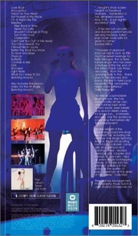 From the 1940's-musical-style opener ("Love Boat") to the kitschily fabulous encore ("Spinning Around"), Kylie's energy level never drops once. Highlights abound: a bright, spangly rendition of her 1989 classic "Hand on Your Heart"; a full-steam-ahead Greatest Hits medley that has the audience practically panting at her feet; a brilliant, twisted-cabaret arrangement of her anthem, "Better the Devil You Know"; an unbelievably erotic take on the Olivia Newton-John ditty, "Physical"; a pumping, sexually-charged "Butterfly"; and the aforementioned "Spinning Around" finale.