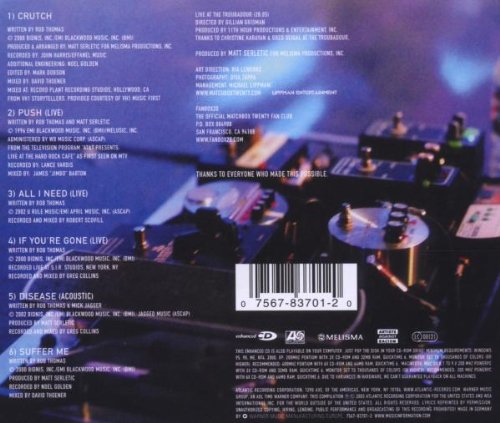 I usually don't like when bands re-invent their songs for live shows, but the versions of "Crutch" and "If You're Gone" are just beautiful on this cd, I saw them preform live before this came out and the e.p. doesn't quite capture the atmosphere of their live shows, which are very upbeat, but this cd offers a unique view of their music and makes this a staple recording to own for any MatchBox Twenty fan.
