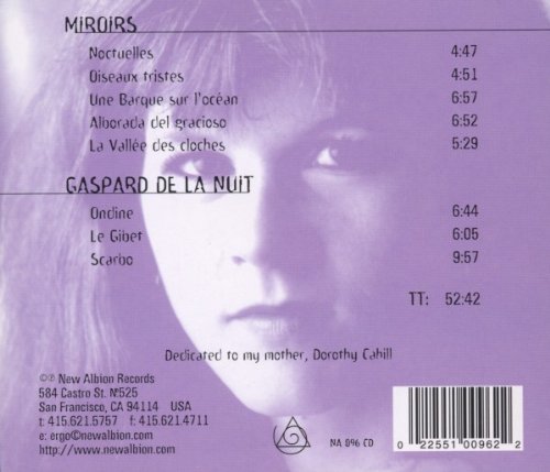 Kudos to New Albion for issuing this great disc. Sarah Cahill is best known for her "new music" performances, but she clearly traces the roots of that music to its source with her recroding of Ravel. A great album worth repeat listenings.