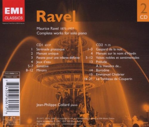 Maurice Ravel's (1875 -- 1937)compositions for solo piano are not extensive, but almost all his works have become part of the standard repertoire. Ravel's piano music fits comfortably on a two-CD compilation. There are many available recordings, but I found this budget-priced reissue by Jean-Philippe Collard is an excellent way to get to know Ravel's piano music. Collard (b. 1948) is a French pianist who is known for his interpretations of French music, especially Saint-Saens and Faure. This CD of Ravel was initially released in 1978 and rereleased in 2005. A review of this CD on answers.com upon its reissue aptly stated that "the playing of Jean-Philippe Collard has a lot to recommend it, particularly in the way it is so naturally expressive. ...Collard's use of dynamics and pedal to color the mood and character of each piece never sounds forced or artificial, nor does he ever sacrifice momentum or expression."