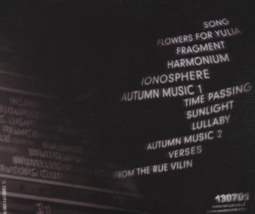 The latter two-thirds of the album is a bit more spotty, and after listening to the release a bunch of times, I still have a hard time pin-pointing why. There are a lot of shorter tracks (like "Ionosphere" and "Lullaby") that add nothing to the release, while a familiar melodic theme is used in "Autumn Music 1," "Autumn Music 2," and the album closer of "From The Rue Vilin." Considering Songs From Before is only about thirty-seven minutes long, it's probably safe to say that the effort suffers a bit from being really good on the front end and then not offering up as much in variety from there out. Richter is still a heck of a composer, and the twelve-track release is always pretty at the very least, but unfortunately it seems like a slight step backwards considering his previous album.