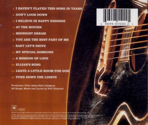 The opening song "I Haven't Played This Song In Years", is a feeling portrayal of a long ago love, and a song most of can probably identify with. Then comes the rousing pep talk, "Don't Look Down". "Midnight Dream" approaches Neil Diamond's stronger and earlier work, at least in my opinion. However, my personal favorite is "A Mission of Love", a real feel good type song which should get anybody's energy level up. That one is first of the last four cuts, each of which is indeed worthy. There's "Elijah's Song", and then the gospel flavored "Leave A Little Room For God", leading up to the tender love song, and the one song here which I may easily, with time, count as one of the best in his whole career, "Turn Down The Lights".