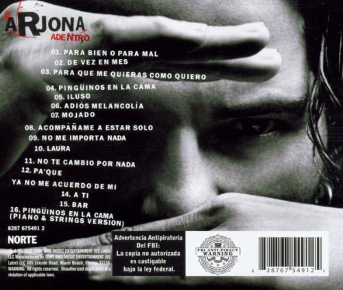 Adentro is a punch to the heart - honest, intense, sensitive, emotional. Its beautiful and poetic lyrics are complimented with magnificent melodies, and further complimented with perfect orchestrations. Each song feels heartfelt - true. Ricardo Arjona's artistic integrity is evident throughout the album, which has an organic yet sophisticated feel.