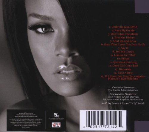 Anyone who's listened to contemporary pop/rock/R&B radio knows Rihanna from her earlier hit singles "Pon De Replay," "S.O.S.," "Unfaithful," and "Break it Off." Her first album, 2005's Music of the Sun was chock full of summer dance anthems, headlined by the reggae dance tune (in the tradition of Sean Paul or Daddy Yankee, both of whom I despise) "Pon De Replay" (which I surprisingly enjoyed) that would most likely be played in any teenage girl's radio with her convertible top down and on the way to either the mall or the beach. Last year's A Girl Like Me wowed many critics who passed off Rihanna as merely another pop teen sensation. The album blended the summer dance jams that most of her fans enjoy with ballads such as "Unfaithful," penned by Ne-Yo.