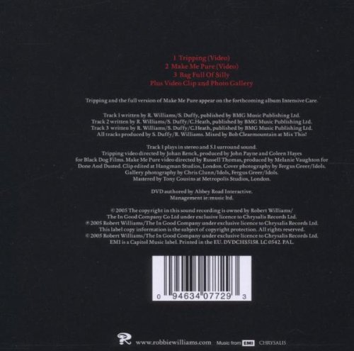 Robbie Williams Album: «Tripping» See larger image Robbie Williams Album: «Tripping» Close See other view Robbie Williams Album: «Tripping» Close Album information Title:Tripping Release date: Type:Audio CD Label:EMI UPC:094634077293 Buy Review - Product Description Robbie Williams Tripping UK DVD Single