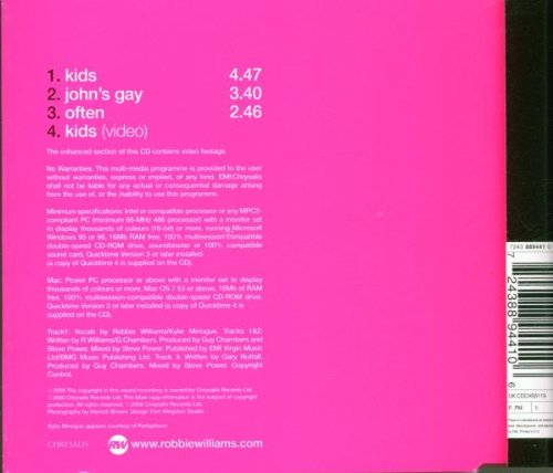 1)Kids-I love this song, since the first time I heard it. I bought "Sing..." just because of this song and eventhough the album is excellent, this song remains my favorite! 2)John's gay-Upbeat song, average B-side, you have to hear the song twice, once you just listen to the music, the second time listen to the lyrics to find out why the song is called like that. 3)Often-Great. Just Robbie and a guitar, Ithink it's a cover however, anyway it's a great slow song. 4)Kids Video-I bought this single cause of the video, it never came out in America (North or South) and when I got this I could finally watch it. It's great its awesome, i cant describe it and kylie looks fine Good stuff! 5 stars!