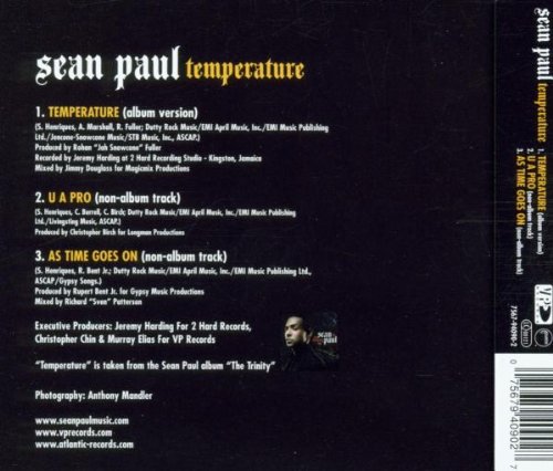 Sean Paul Album: «Temperature» See larger image Sean Paul Album: «Temperature» Close See other view Sean Paul Album: «Temperature» Close Album information Title:Temperature Release date:2006-05-23 Type:Audio CD Label:Wea/Atlantic UPC:075679409027 Buy Track listing 1 Temperatureimg 3:42 2U a Pro (Non-Album Track) 3As Time Goes On (Non-Album Track)