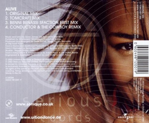 Sonique Album: «Alive [Single-CD]» See larger image Sonique Album: «Alive [Single-CD]» Close See other view Sonique Album: «Alive [Single-CD]» Close Album information Title:Alive [Single-CD] Release date: Type:Audio CD Label:Import UPC:602498120019 Buy Review - Product Description Tracks: [Original Mix] 3:50 / [Tomcraft Mix] 7:03 / [Benni Benassi Sfaction First Mix] 5:51 / [Conductor & The Cowboy RMX] 7:45