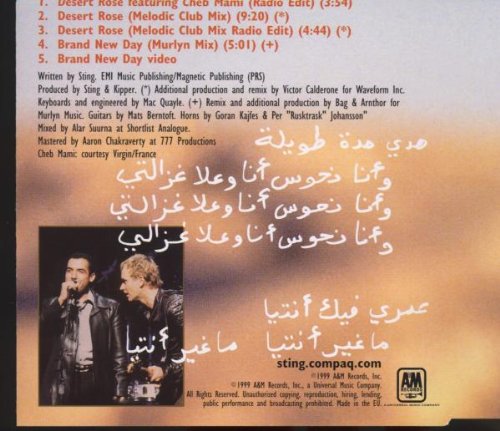 I bought this cd single for the full 12" mix of the Victor Calderone remix for "Desert Rose". The American cd single didn't feature it so I bought the import. The tracks are as following:Desert Rose Radio Mix(3:54),Melodic Club Mix(9:20)and the Melodic Radio mix(4:44) plus Brand New Day (Murlyn Mix-5:01). The Victor Calderone mix fuses House music with Middle eastern type music very well. Was a top five club play track in 2000 and spent 9 weeks atop the Sales Dance Chart.Great song.