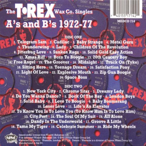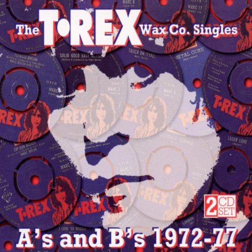 Full title, 'The T. Rex Wax Co. Singles A's & B's, 1972-1977'. This double CD mid-price package features all 19 A-sides issued on Bolan's own T. Rex Wax Co. label during his lifetime, accompanied chronologically by their 25 B-sides (several singles had two tracks on the B-side). Many of these singles did not appear on Bolan's contemporary albums. Packaging is based on the distinctive blue & red T. Rex Wax Co. 7 inch single label & house bag design. Also includes an extensive track-by-track annotation.
