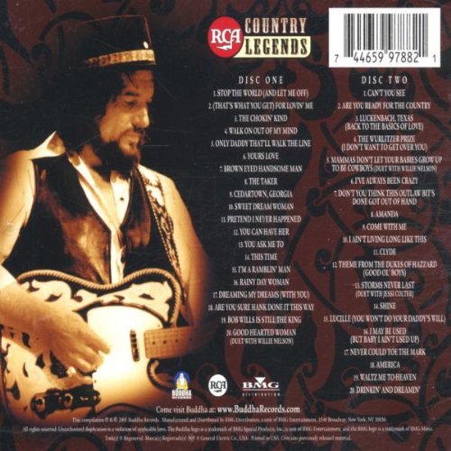 ...Prior to buying this double CD after Waylon's death, the only Waylon I knew was from the Dukes of Hazzard and his wildly popular duets with Willie Nelson. I NEVER expected that I would become absolutely HOOKED on this double CD! This RCA Country Legends double CD set of Waylon's best fit the bill very well. It covers much of his popular material from 1965 through 1985. I immediately heard some songs that I had forgotten were his such as "Sweet Dream Woman", "Are You Ready for the Country", and "America". The smiles soon began. His version of Marshall Tucker's "Can't You See" put my toes a tappin and the Waylon bug began to bite me hard! What really got me going though, were several fabulous songs I had never heard before, but found electrifying: "Are You Sure Hank Done It This Way", "I've Always Been Crazy", and the stomping early Rodney Crowell penned "I Ain't Living Long Like This". The Willie Nelson and Outlaw songs are well represented and continue to satisfy along with his early material, particularly "(That's What You Get) For Lovin' Me", "Only Daddy That'll Walk the Line", and "Rainy Day Woman". The songs that really sold me though, were the distinctively non-conformist screwball songs that I couldn't help but like such as "Bob Wills Is Still the King", "Clyde", "I May Be Used (But Baby I Ain't Used Up)", and "Never Could Toe the Mark". The coup de grace for my hopes of resisting Waylon's musical magnetism was the final cut on Disc 2 from 1985 called "Drinkin' and Dreamin'". Country fan or not, I will proffer the thought that every man on earth can sometimes relate to (or at least understand) these lyrics: