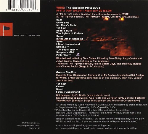 I believe, among superstitious actors, that "The Scottish Play" refers to the work that should not be pronounced which we know as "Macbeth." Typically erudite for our always sly Wire! I plucked this at a record store going out of business; I had no idea it was issued, even though I count myself a Wire fan. On Amazon, as it's filed only under DVDs, you may be confused about its contents. "The Scottish Play: 2004" bookends "On the Box: 1979" as the latest rather than the earlier Wire. It's a 53-minute Tom Gidley DVD concert film plus CD soundtrack for the Glasgow show. The songs are largely from the Read & Burn and Send period of Wire phase 3, with a more aggressive focus than their experimental-meets-dancefloor late 80's phase 2. A few songs at the end of the film hearken back to their late 70s art-punk. This is no posed passion, but a true act of "performance."